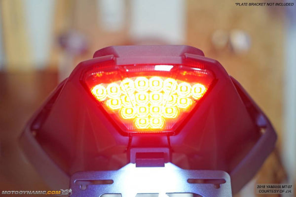 Introducing the Yamaha MT07 sequential integrated LED tail light from Motodynamic. Motodynamic takes a step up when producing their LED integrated tail lights by having multiple programmable features, including their sequential turn signals. This means you will get a smooth, cascading turn signal motion, instead of the standard blinking.
